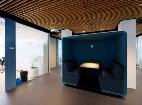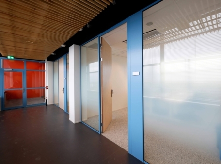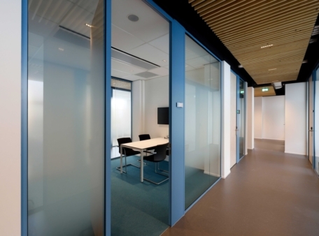 Een goed voorbeeld daarvan zijn de metselwerkwanden die in de oude indeling de ruimtes van 25 m2 definieerden. Door de nieuwe indeling moesten alle wanden eruit, was de conclusie bij de renovatie van de onderste zes etages. Voor de volgende etages was de conclusie anders: we moeten wat met die metselwanden, dat kan duurzamer. In het middengedeelte van de verdiepingen zijn de metselwanden iets ingekort en afgezaagd, maar bleven voor het grootste gedeelte behouden. Aan de vleugels van de etages zijn de metselwerken wel weggehaald. Er zijn systeemwanden geplaatst, omdat het gebruik van het gebouw juist in die zones flexibel moet blijven. Als isolatie voor de nieuwe wanden zijn glaswoltegels gebruikt die eerder het systeemplafond vormden. Zo is dit materiaal niet onnodig op de vuilstort terecht gekomen en was nieuw isolatiemateriaal niet nodig.