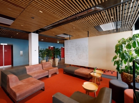 Datzelfde geldt voor oude linoleum vloeren. 2.500 m2 linoleum is door de vloerenfabrikant Forbo zorgvuldig losgemaakt en teruggestuurd naar de fabriek, om er vervolgens na vermaling weer nieuw linoleum van te maken. Deze techniek om het oude linoleum zo schoon mogelijk te verwijderen is nog in ontwikkeling. Een deel van het vermalen linoleum , zo’n 500 m2, is door meubelproducent Cooloo gebruikt om stoffering te produceren voor de bankjes, die nu de open ruimtes op iedere verdieping sieren. In totaal is hiermee 7.750 kilo materiaal opnieuw ingezet. Dit staat gelijk aan een besparing van 10.000 kg CO2.