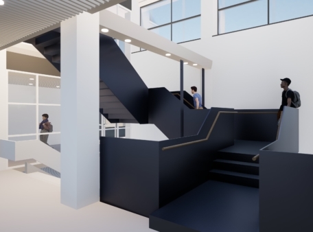 Er wordt een nieuwe trap gerealiseerd tussen de eerste en tweede verdieping. Die maakt het studiegebied op de tweede verdieping beter bereikbaar en zorgt minder drukte in de liften.