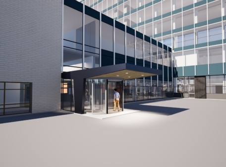 De huidige ingang wordt voorzien van een draaideur. Dit zorgt voor minder tocht, een prettiger binnenklimaat en een betere doorstroming van bezoekers.