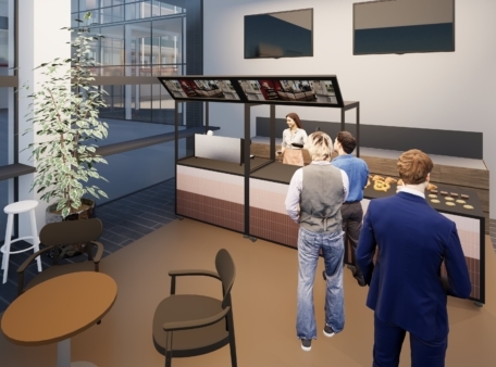 De koffievoorziening wordt vernieuwd en bemand. Dit wordt een levendige plek op de huidige plek van de Service Desk. Studenten, medewerkers en bezoekers kunnen elkaar hier ontmoeten.