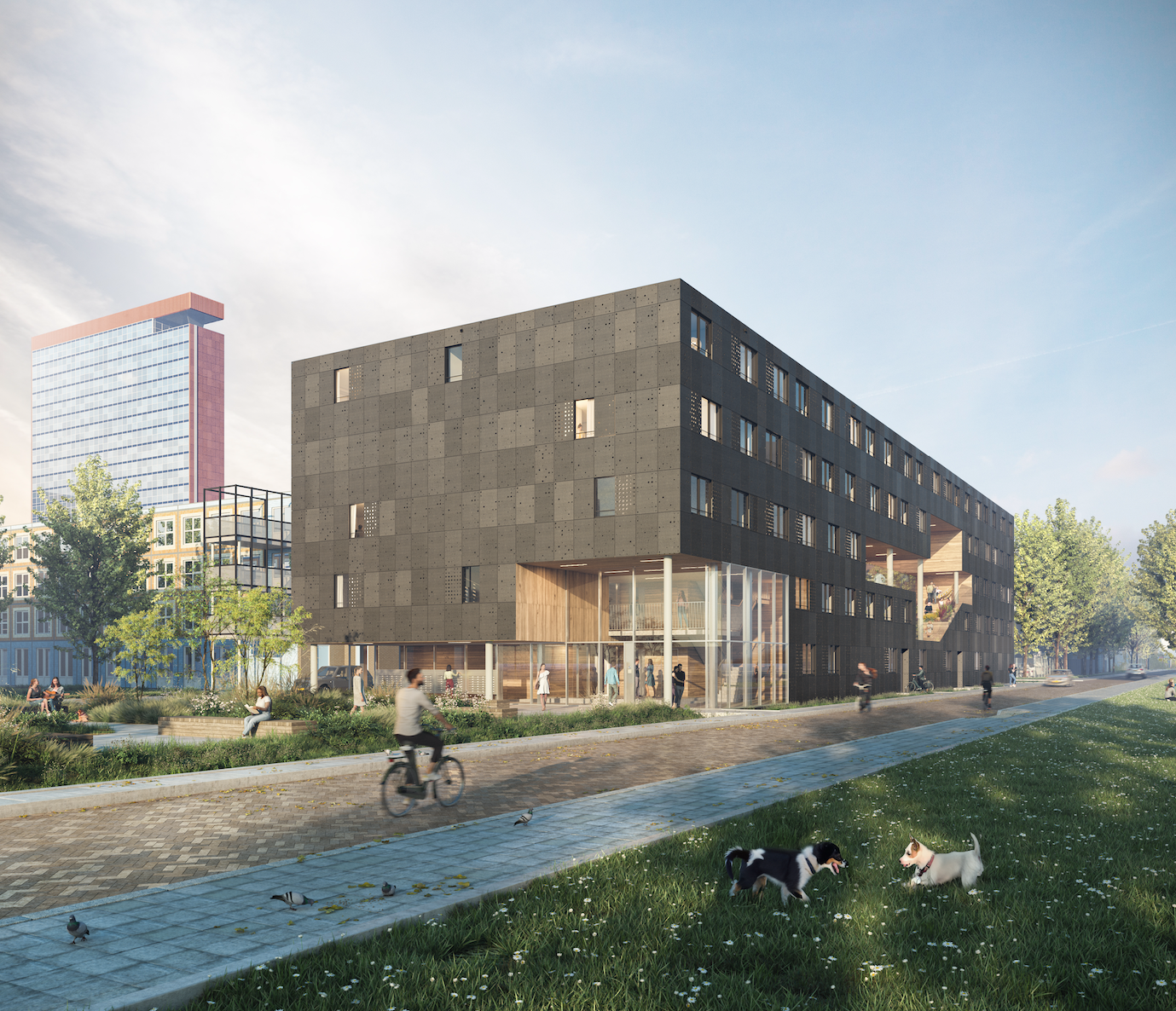 BalPol IV is home to 136 student flats and a 300 sqm common room in a covered outdoor area. What’s more, the building is all-electric and features a thick building envelope to ensure at least energy label A or A+. The green roof contributes to biodiversity and provides cooling. The façade is fitted with bat boxes.